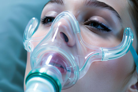 Female patient performing respiratory training, comfortably breathing with oxygen mask connected to respiratory device, promoting lung capacity and overall respiratory health, close-up.