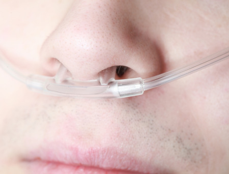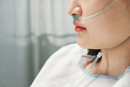 Close-up side view shot of young Asian woman wearing nasal cannula getting respiratory help in emergency room