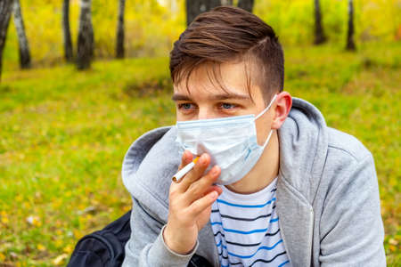 Man in the Flu Mask smoke a Cigarette in the Autumn Forest