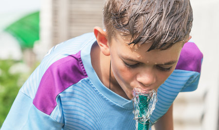 Child makes inhalation at home with nebulizer on out of focus background. Example of combating respiratory diseases such as tracheitis bronchitis pneumonia with medical equipment at home conditions.