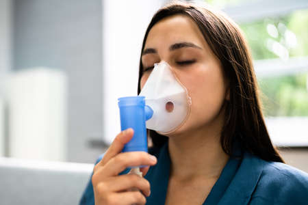 Use nebulizer and inhaler for the treatment. Young woman inhaling through inhaler mask