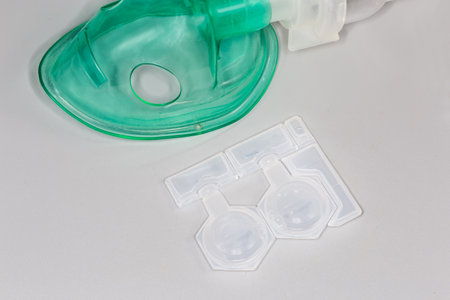 Transparent plastic capsules with medicine doses for respiratory diseases treatment with jet nebulizer, view close-up against the nebulizer mask on a gray background