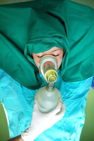 Anesthesiologist making ingalation anesthesia for patient. Doctor puts a mask on the patient before starting operation.