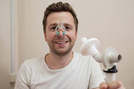 Young man testing breathing function by spirometry