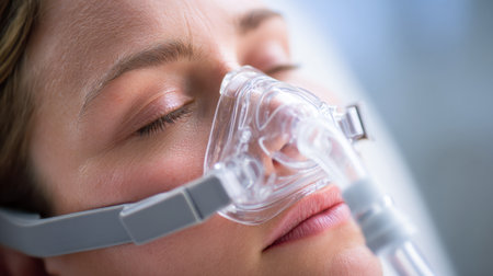 A tranquil scene featuring a woman with eyes softly closed, seated calmly in a clinical space, wearing a clear breathing aid to support her well-being.