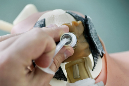 Insertion the tracheal tube during Cricothyrotomy. Anatomy model for simulation classes. Cricothyrotomy training manikin.