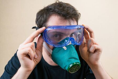 Young man in protective respirator and glasses during self-isolation and quarantine sloseup. Stay home