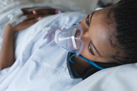 African american female patient with oxygen mask, lying on bed in hospital room. Hospital, medicine and healthcare, unaltered.