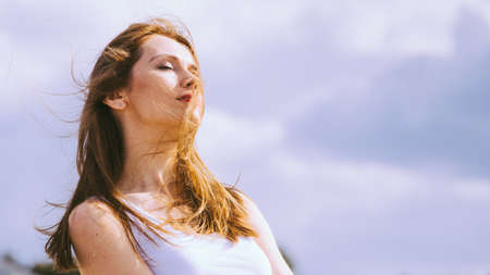 Young woman relaxing outdoor. Female enjoy sunlight against blue sky.