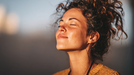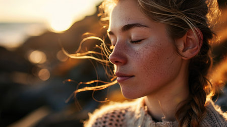 A woman with closed eyes and a peaceful expression is bathed in warm sunset light, creating a serene and reflective moment.