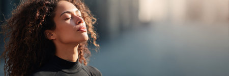 A woman with curly hair stands peacefully, her eyes closed, against a soft blue background of misty mountains during twilight. Calmness fills the atmosphere.