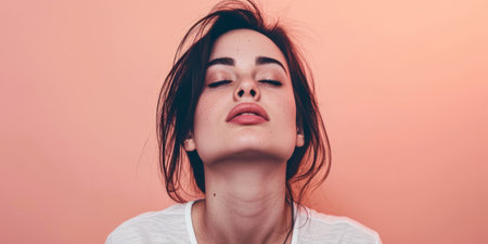 A young woman stands on the beach eyes closed savoring the peaceful ocean air at sunset.