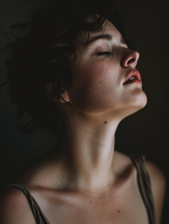 A person is depicted with eyes closed, showing a range of emotions and skin textures under soft, controlled lighting, set against a dark background.