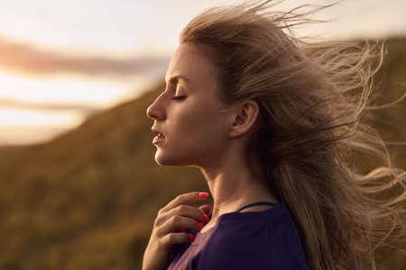 Beautiful young woman with closed eyes breathing relaxing enjoying sun at sunset. Beauty sunshine girl portrait.