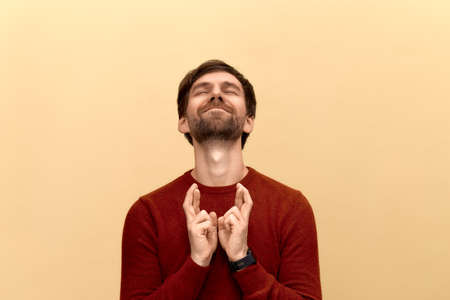 Photo of young man with beard wearing sweater, looking up, raises fingers crossed, makes desirable wish, posing against yellow background.