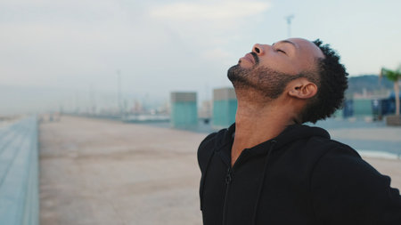 A hopeful African American man gazes upward, embodying inspiration and confidence. This portrait captures emotions of positivity, serenity, and determination.