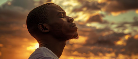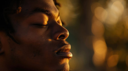 African American man looking up with closed eyes, feeling peace and hope, illuminated by golden light against bokeh background