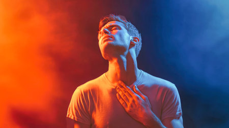 A man clutches his chest in agony, illuminated by intense red and blue hues, conveying deep emotional and physical turmoil in a striking atmosphere.