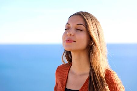 Close up of beautiful relaxed girl breathing and smiling with blue sea on the background.