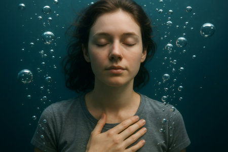 Woman floating peacefully underwater with eyes closed, hand on chest, surrounded by rising bubbles, symbolizing calm and introspection
