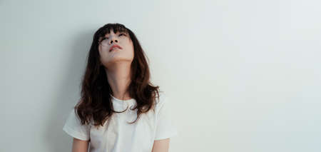 portrait of beautiful young pensive thoughtful woman with long curly hair looking up at copy space