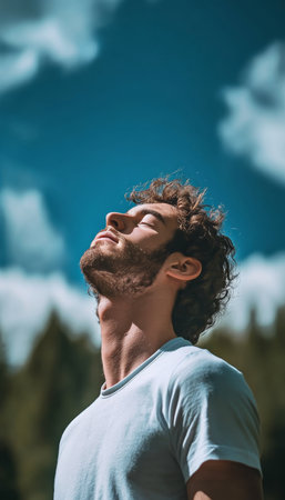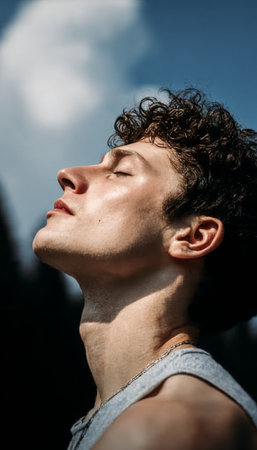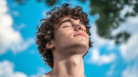 Young Man with Curly Hair Enjoys Sunshine in Serene Forest, Relaxing with Deep Breath Under Blue Sky
