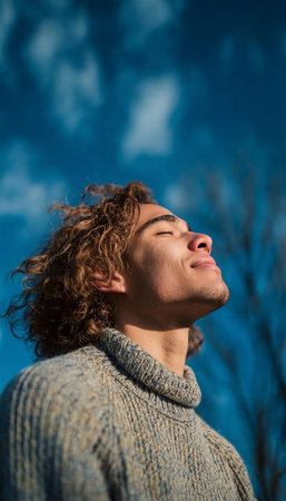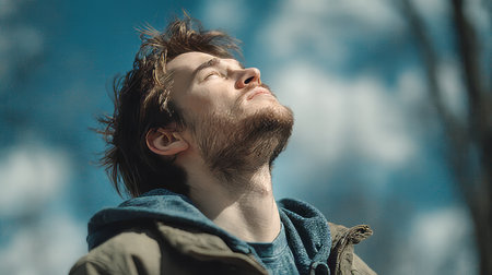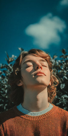 Portrait of a Serene Young Man Enjoying Natures Beauty, Eyes Closed Under a Blue Sky with Clouds.
