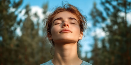 Young Adult Breathing Deeply in the Forest, Embracing Nature, Mindfulness, and Inner Peace