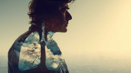 This stunning double exposure image features a human silhouette combined with nature elements, showcasing the connection between humanity and the environment.