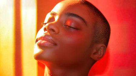 African beauty portrait in golden sunlight with red backdrop glow. Artistic profile with natural skin luminance and minimal aesthetic. Fashion model in light with peaceful grace. Ai generated