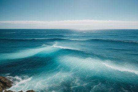 AI Generated. Blue Ocean Waves and Clear Sky Under Bright Sunlight