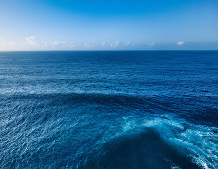 Beautiful Atlantic ocean during sunny day - top view. Beautiful water landscape of deep blue sea . Aerial View of ocean with skyline. Relax and meditation concept. Oceanscape - Drone view