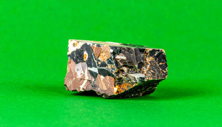 A fascinating specimen of breccia rock, showcasing a mosaic of colorful, angular fragments cemented together over millennia. Isolated on a vibrant green background, this raw geological treasure tells a story of ancient forces and natural artistry, perfect for scientific or educational concepts.