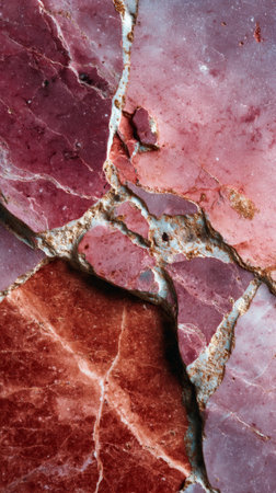 Close-up texture of Rosso Levanto marble stone with vibrant burgundy, pink, and red colors, detailed veining patterns and natural cracks for interior or architectural use.