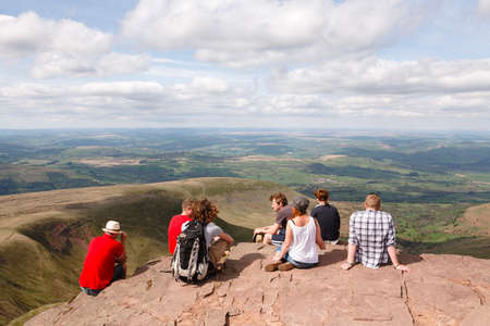 BRECON BEACONS, UK - April 25, 2011. Mixed group of young Caucasian people, hikers sitting on the peak of Pen Y Fan, Brecon Beacons, Wales, UK