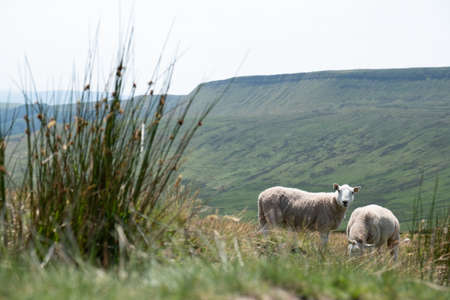 Sheep grazing in front of Penyfan and Corn Du, the highest peaks on the Brecon Beacon mountains in South Wales, UK