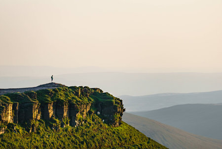 Man standing on a cliff looking out over the valley during sunset. Shot in Brecon Beacon in early summer. Wales