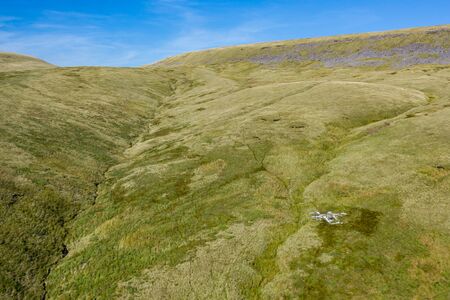 Aerial drone view of an old aircraft crash site on a Welsh hillside in the Brecon Beacons