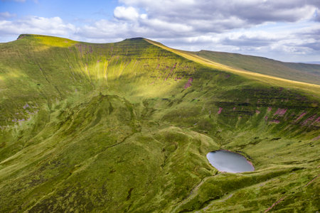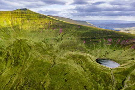 Aerial view of a beautiful glacier-formed lake at the foot of a mountain (Llan y fan Fawr). Brecon Beacons, Wales