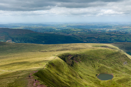 Cloudy bright view down to the valley at the peack of Pan Y Fan in Brecon Beacons, Wales