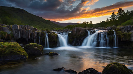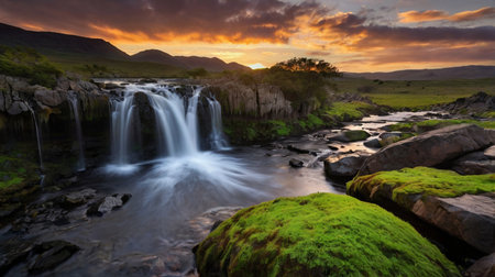A long exposure of a beautiful waterfall in the Scottish Highlands at sunset