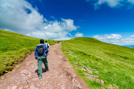 Brecon Beacons, Wales - May 05, 2017: People in distance walking on the footpath that leads to Pan Y Fan peak of Brecon Beacons in Wales..
