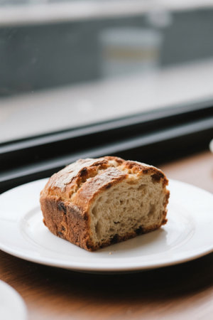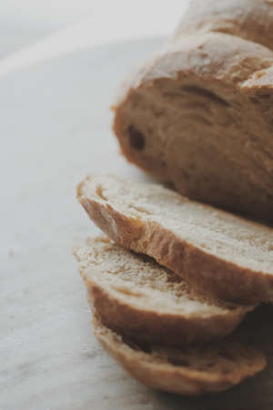 Sliced bread on a white plate in morning light, cozy kitchen concept