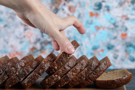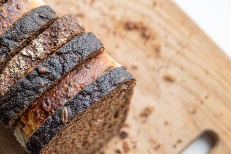 Pieces of black bread close-up on a wooden board. Wheat homemade bread