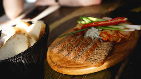 Yeast bread, whole grain rye bread. The starter is on the table. Homemade bread with natural sourdough is an organic bio-product. Handmade product, slices of bread on serving.Bread sliced on a cutting board.created with the help of artificial intelligence.