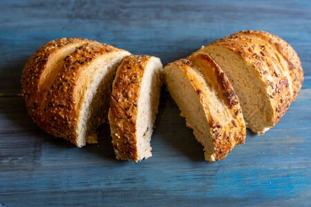 Artisan seed bread on a blue table, ideal for tapas or sandwiches