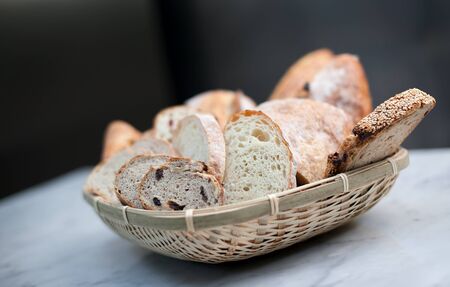 Breads in a basket against black background and marble top