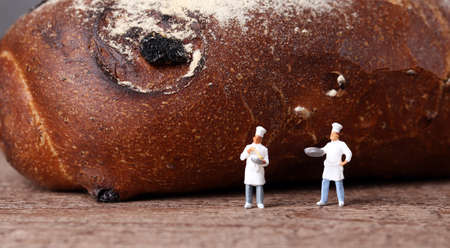 Roasted bread and two miniature chefs. Miniature people and business concept.