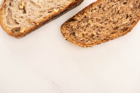 top view of fresh brown bread slices on white background