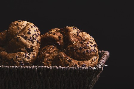 Breakfast server. Isolated cooked buns on dark background.